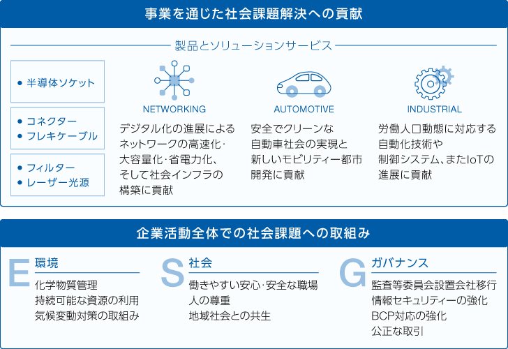 当社は、テストソリューション事業、コネクタソリューション事業、光関連事業を通じ、社会課題解決への貢献とESGを軸とした企業活動を実施することで、財務戦略と非財務戦略の統合経営を目指します。マテリアリティ(重点課題)については、サステナビリティ委員会を中心に、目標と指標を定め取り組んでまいります。